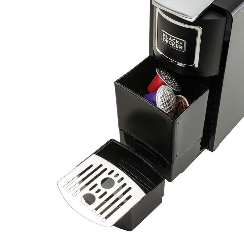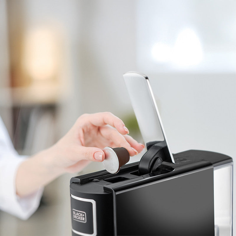 Experience café-quality coffee at home with the Black+Decker Capsule Coffee Maker. Designed for espresso, double espresso, or lungo, this machine delivers high-quality brews at the touch of a button. Its compact and stylish design fits seamlessly into your kitchen or office, while the single-side one-touch control panel ensures quick and effortless operation. Brew your favorite coffee in under 40 seconds and enjoy the precision and craftsmanship of professional-quality coffee every time.